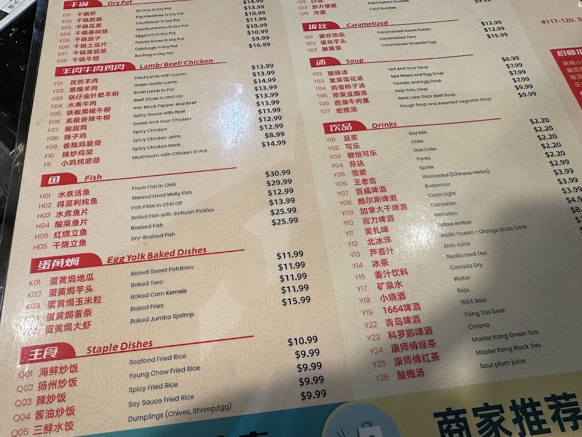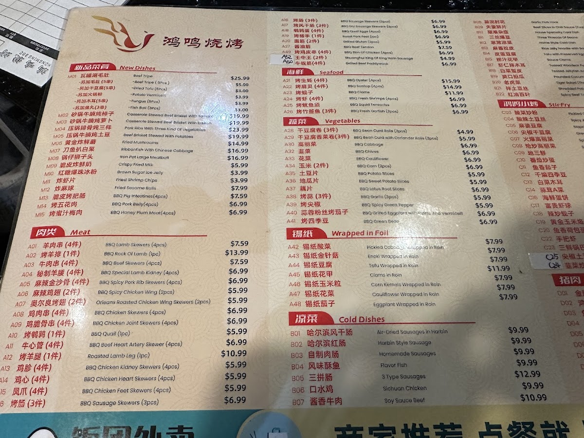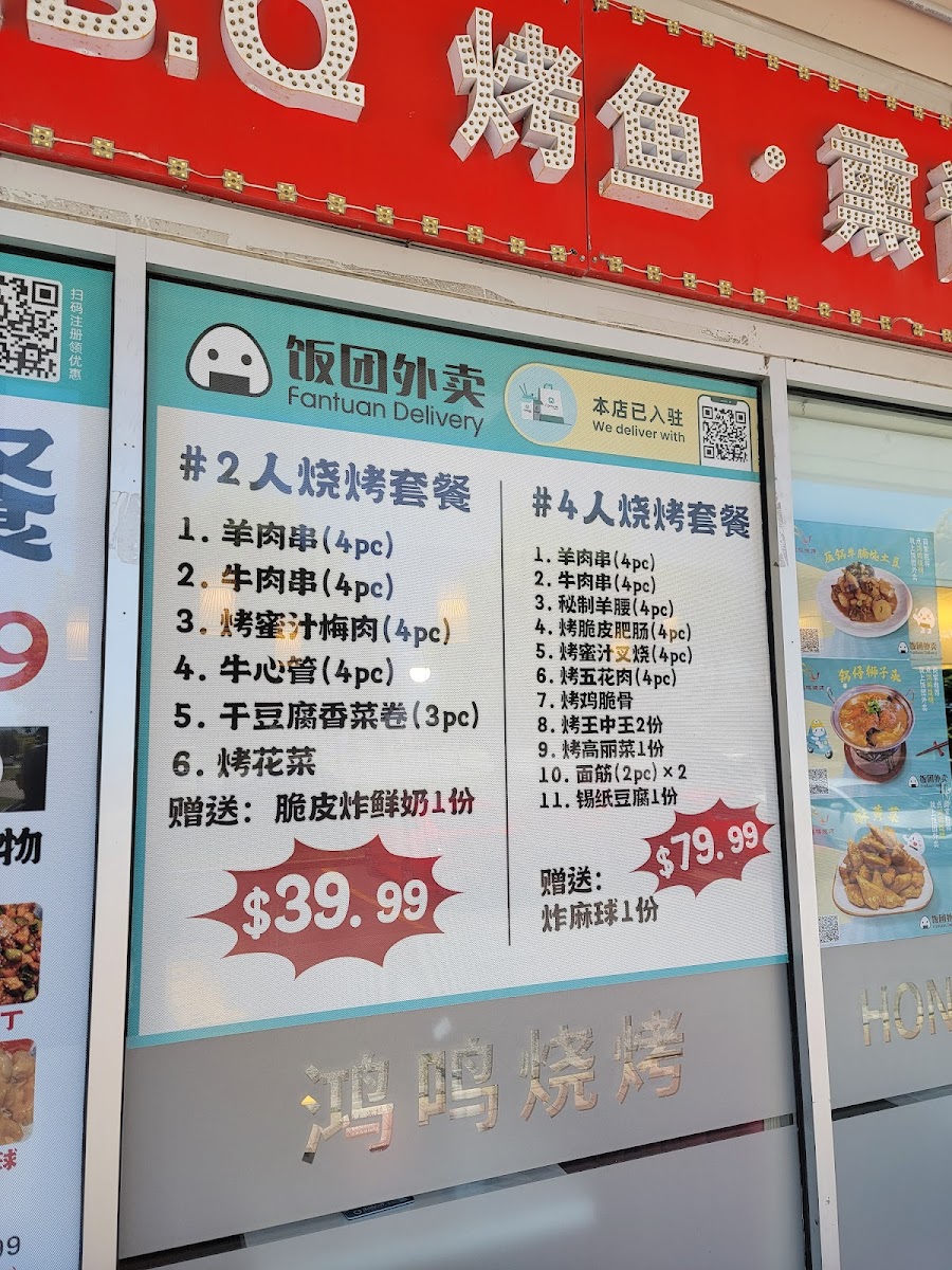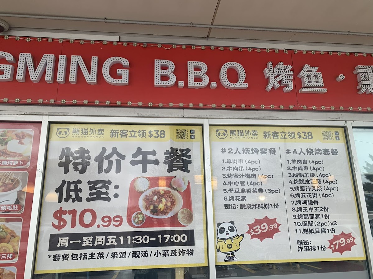 Hong Ming BBQ offers a wide variety of flavorful dishes that cater to all tastes, especially those who love grilled meats and Sichuan-style flavors. Their menu features a selection of skewers, including 羊肉串 (lamb skewers) and 牛肉串 (beef skewers) for $5.99 (4 pieces), and 鸡肉串 (chicken skewers) for $4.99 (4 pieces). For those craving more adventurous options, the 秘制羊腰 (marinated lamb kidneys) for $6.99 and 麻辣鸡翅 (spicy chicken wings) for $4.99 (2 pieces) are excellent choices. The restaurant also serves various grilled vegetables and sides, such as 烤玉米 (grilled corn) for $4.99 (2 pieces) and 烤韭菜 (grilled chives) for $4.99. For something heartier, their 金牌锅包肉 (crispy sweet and sour pork) for $11.99 and 鸿鸣小炒肉 (stir-fried pork) for $10.99 are both popular options. If you're in the mood for a spicy dish, the 毛血旺 (spicy Sichuan-style hot pot) for $11.99 is a must-try. They also serve an array of seafood, including 水煮活鱼 (boiled live fish) for $22.99 and 干锅虾 (dry pot shrimp) for $13.99. For a unique twist, try the 麻辣小龙虾 (spicy crayfish) for $13.99 per pound. The menu also features comforting sides like 海鲜炒饭 (seafood fried rice) for $9.99 and 扬州炒饭 (Yangzhou fried rice) for $7.99. To complement the meal, they offer refreshing drinks such as 雪碧 (Sprite) and 可乐 (Coke) for $1.80.
