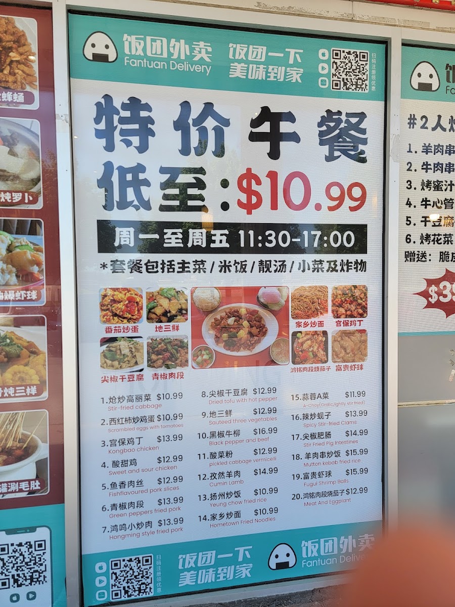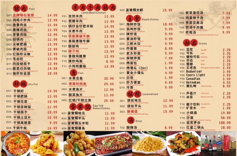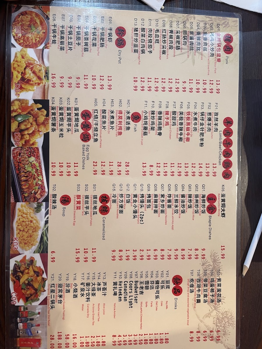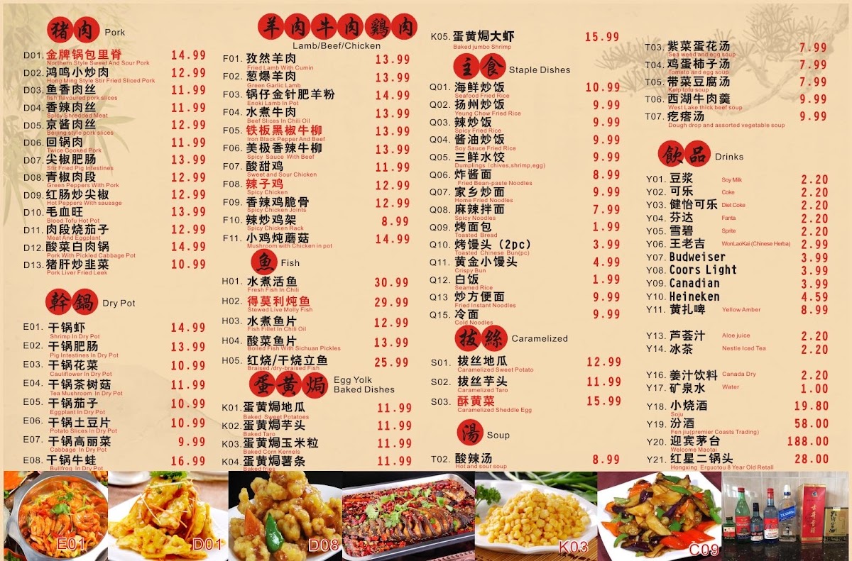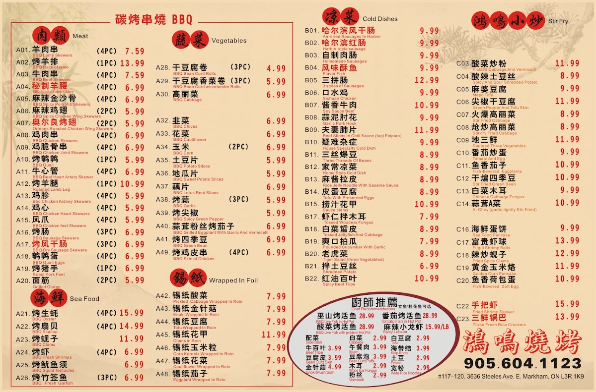 Hong Ming BBQ offers a wide variety of flavorful dishes that cater to all tastes, especially those who love grilled meats and Sichuan-style flavors. Their menu features a selection of skewers, including 羊肉串 (lamb skewers) and 牛肉串 (beef skewers) for $5.99 (4 pieces), and 鸡肉串 (chicken skewers) for $4.99 (4 pieces). For those craving more adventurous options, the 秘制羊腰 (marinated lamb kidneys) for $6.99 and 麻辣鸡翅 (spicy chicken wings) for $4.99 (2 pieces) are excellent choices. The restaurant also serves various grilled vegetables and sides, such as 烤玉米 (grilled corn) for $4.99 (2 pieces) and 烤韭菜 (grilled chives) for $4.99. For something heartier, their 金牌锅包肉 (crispy sweet and sour pork) for $11.99 and 鸿鸣小炒肉 (stir-fried pork) for $10.99 are both popular options. If you're in the mood for a spicy dish, the 毛血旺 (spicy Sichuan-style hot pot) for $11.99 is a must-try. They also serve an array of seafood, including 水煮活鱼 (boiled live fish) for $22.99 and 干锅虾 (dry pot shrimp) for $13.99. For a unique twist, try the 麻辣小龙虾 (spicy crayfish) for $13.99 per pound. The menu also features comforting sides like 海鲜炒饭 (seafood fried rice) for $9.99 and 扬州炒饭 (Yangzhou fried rice) for $7.99. To complement the meal, they offer refreshing drinks such as 雪碧 (Sprite) and 可乐 (Coke) for $1.80.